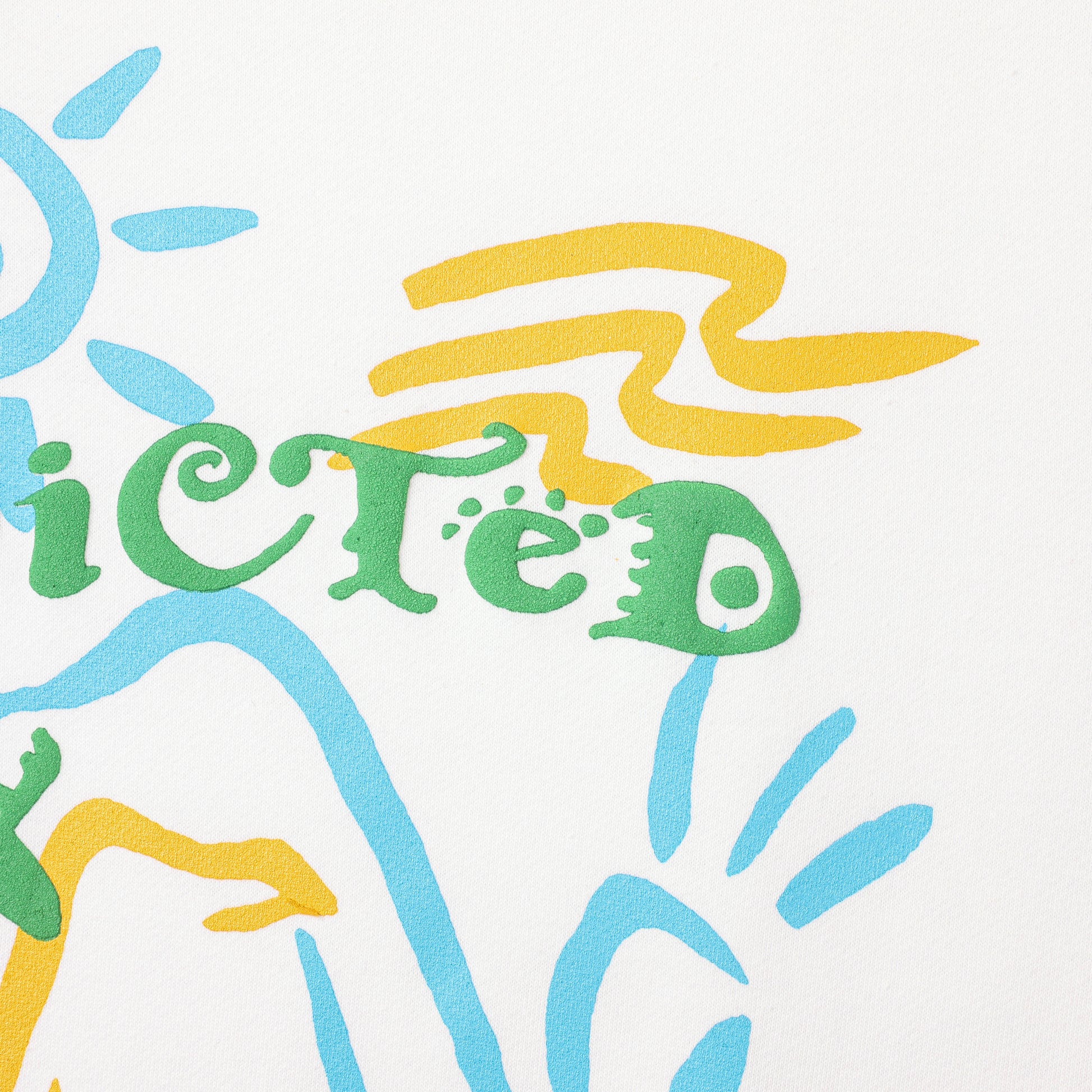 80's inspired drawing screen printed on the front with text "Addicted to Sax" printed in puff print