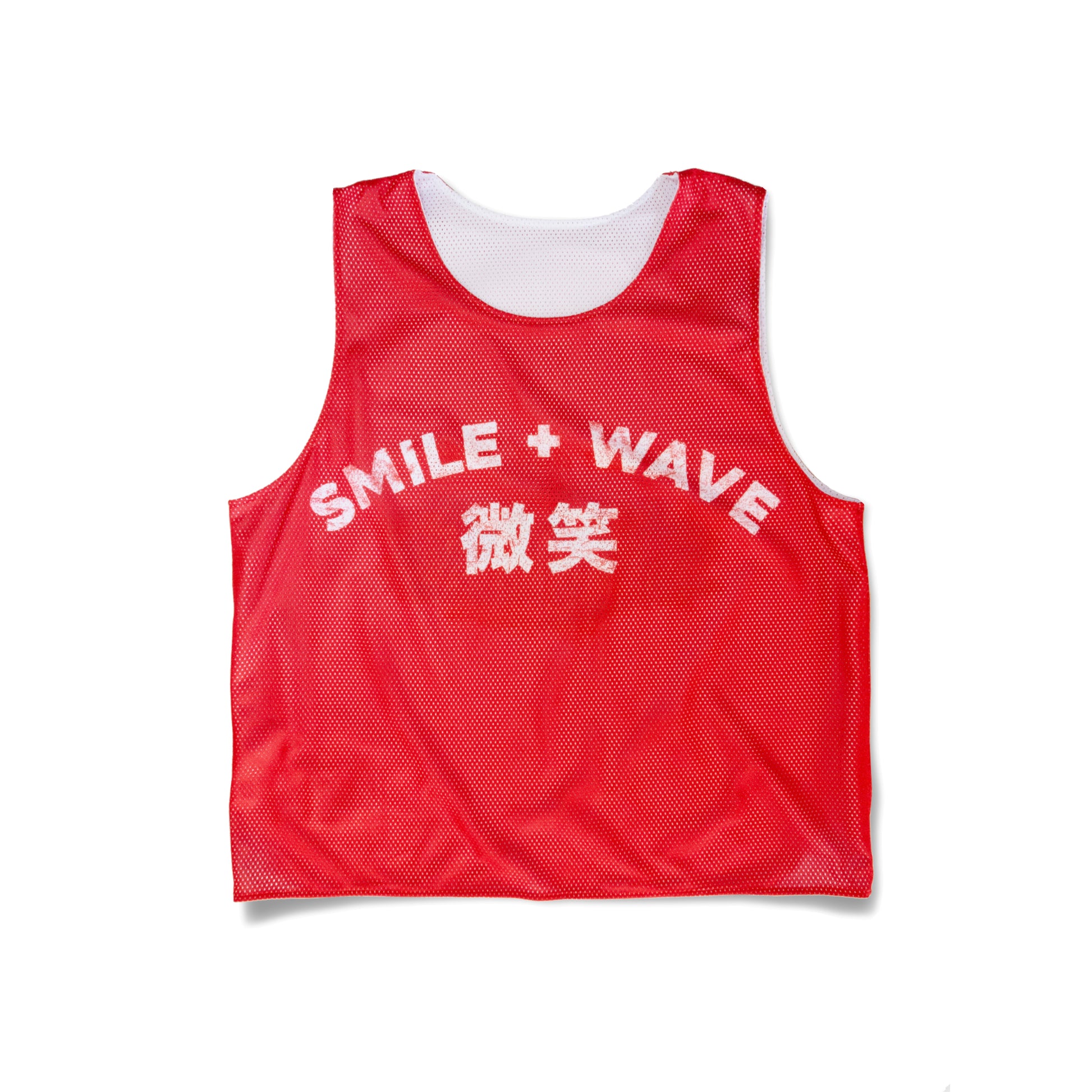 • Side 2 - plain red with Smile and Wave distressed text printed across the chest.