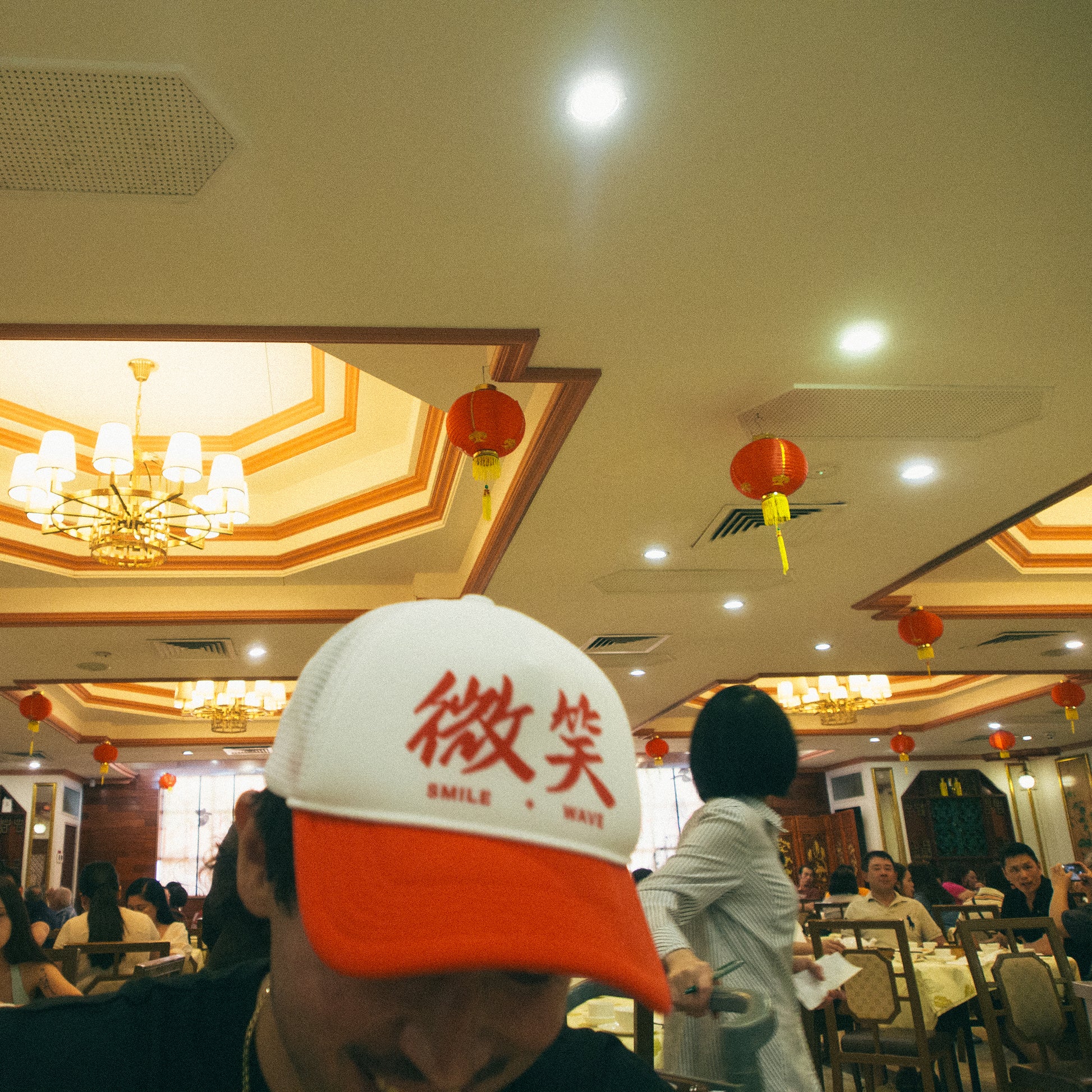 Mesh backed trucker cap with a foam crown and decorative rope. 'Smile and Wave' printed across the front crown.
